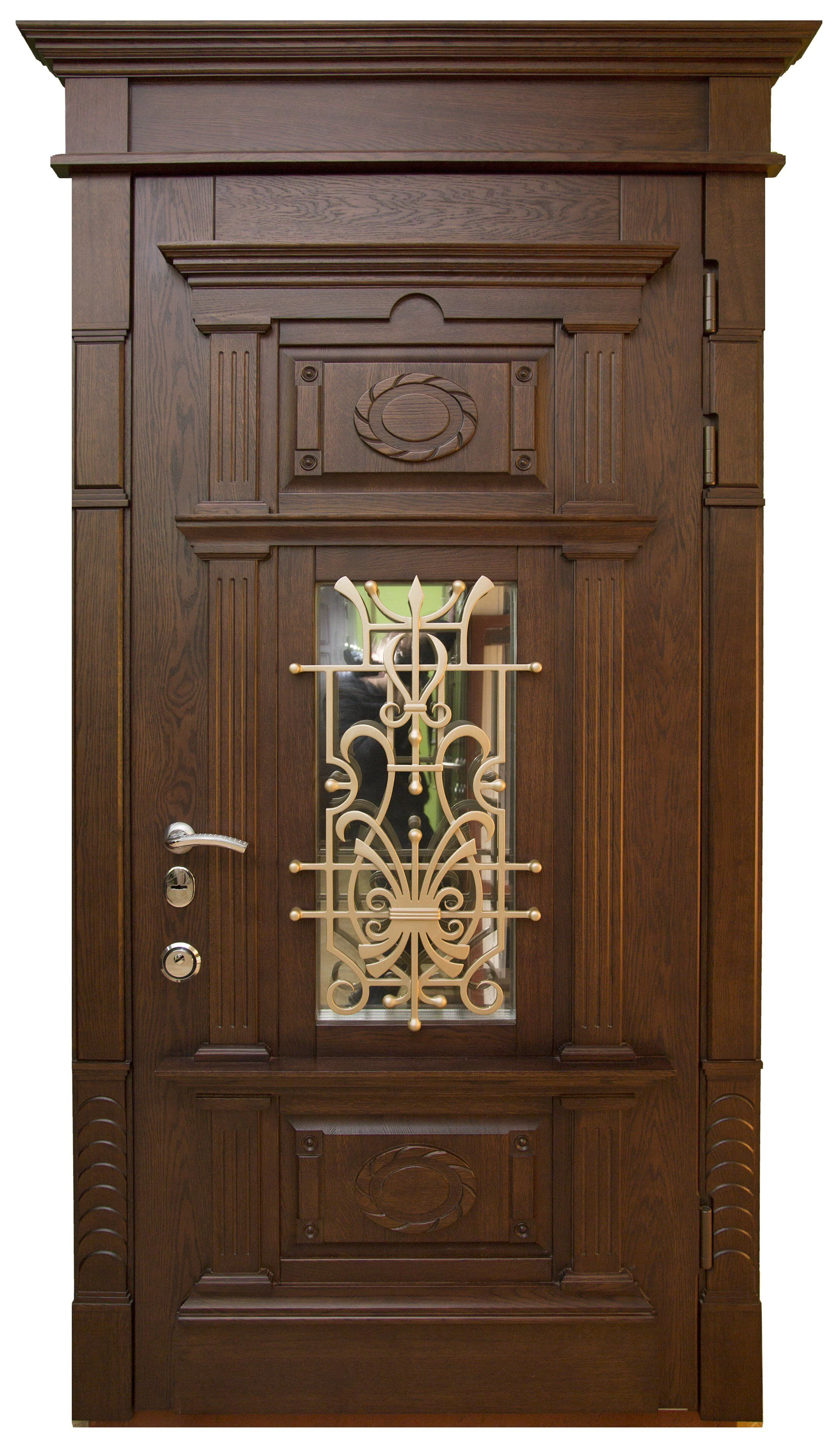 Входные двери. Они сочетают металлический каркас с массивной отделкой, обеспечивая надежную защиту от взлома, а также отличные тепло- и шумоизоляционные характеристики. Варианты массива позволяют добиться солидного и эстетичного внешнего вида, сочетающегося с любым фасадом.